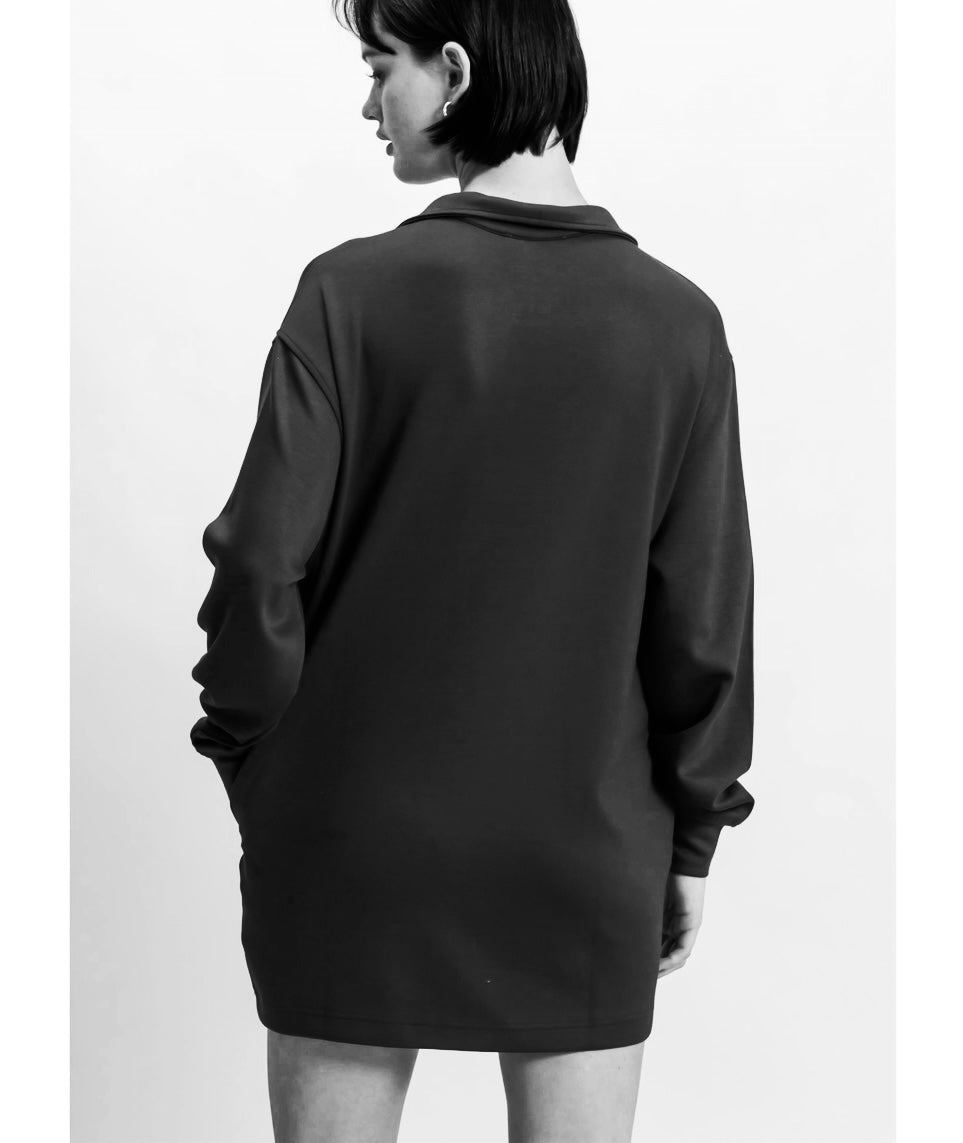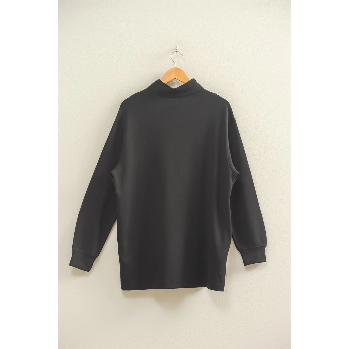 This dress will be your go-to for casual days. Soft scuba fabric shapes this piece that has a high neckline leading to half zip-up cut. The long sleeves come with drop shoulders as the dress shapes a loose silhouette with a mini hem and side pockets.