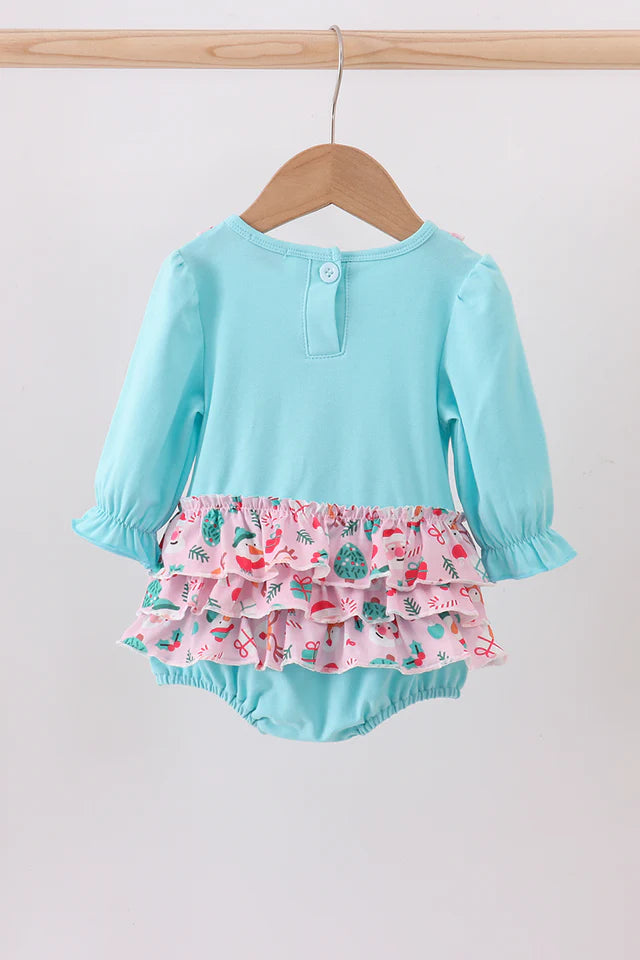 Bring festive cheer with this playful Blue Christmas Santa Claus Applique Ruffle Bubble. Featuring a charming Santa design in cool blue tones, this bubble outfit adds a whimsical twist to holiday celebrations. The ruffle details enhance its cute, bouncy silhouette, making it perfect for little ones to wear during joyful family gatherings or holiday photos. Celebrate the season in style and comfort with this adorable festive outfit.