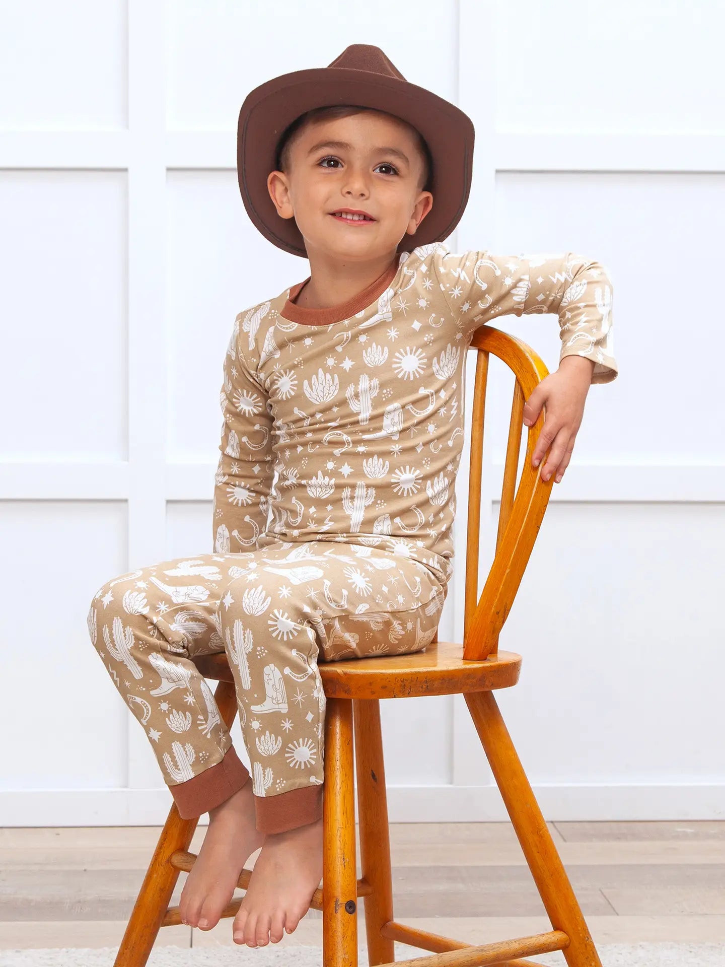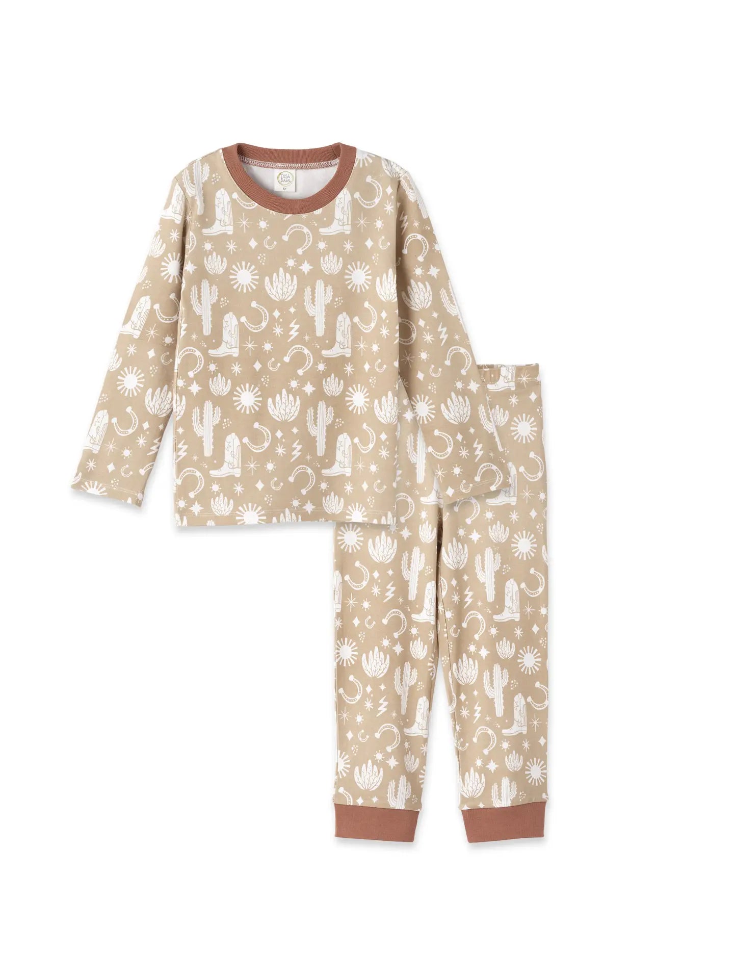 Western cowboy boys pajama set made of ultra-soft bamboo/cotton/spandex blend jersey. Bamboo is absorbent, hypoallergenic, eco-friendly, and sweat-resistant. The top has a crew neck and the bottoms have an elastic waist. Machine Wash Warm. Tumble Dry Low.