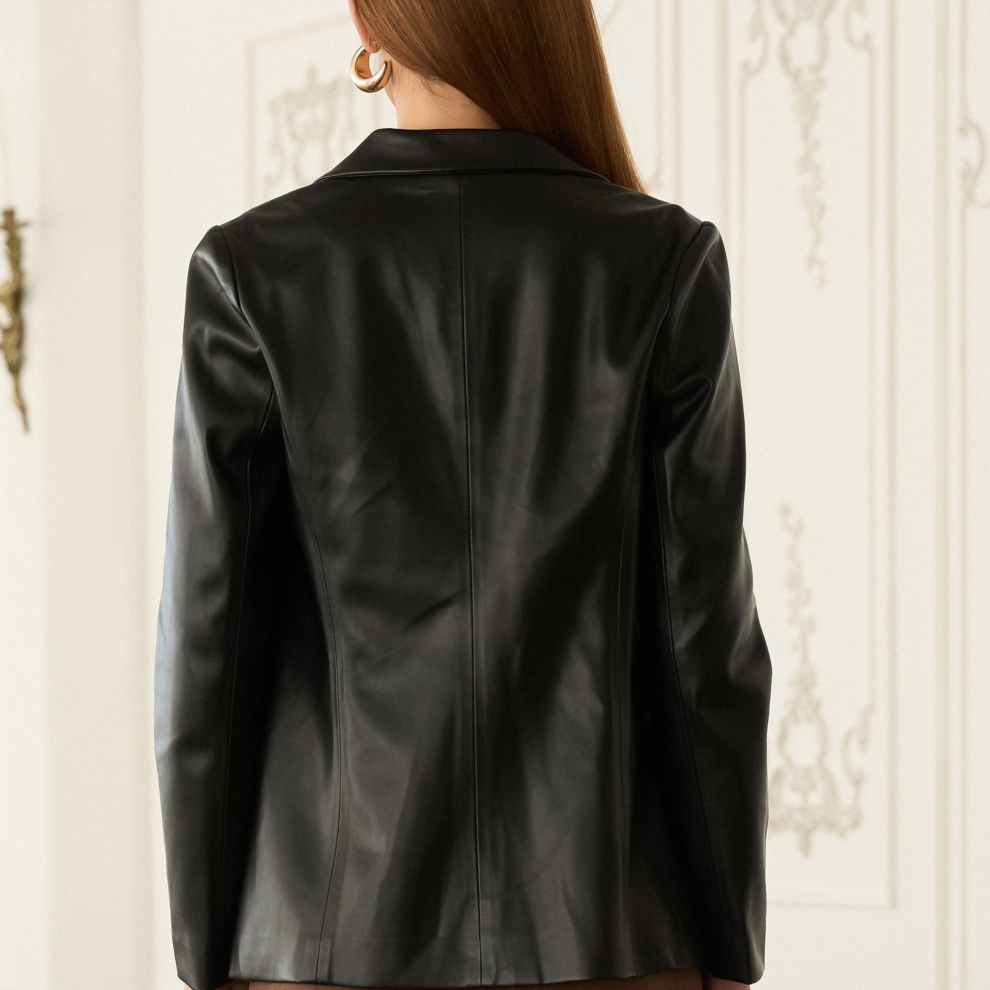 Sleek and modern, this open-front blazer is crafted from supple faux leather