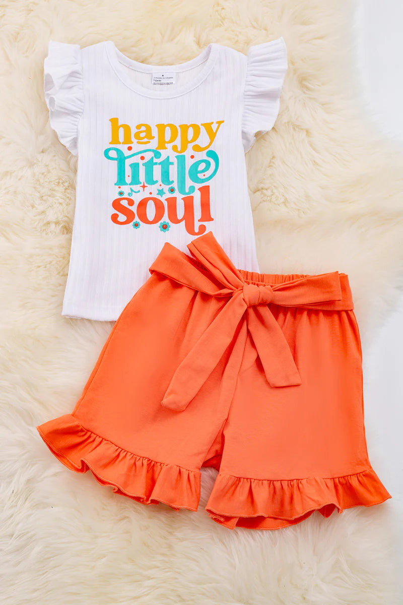 Upgrade your summer wardrobe with our "Happy Soul" Angel sleeve top and orange shorts set! The top features a blend of 27.9% cotton, 65.1% polyester, and 7% spandex for ultimate comfort and durability. The shorts are made of 97% cotton and 3% spandex, providing a perfect fit for any body type. Elevate your style and feel confident with this trendy and versatile outfit.