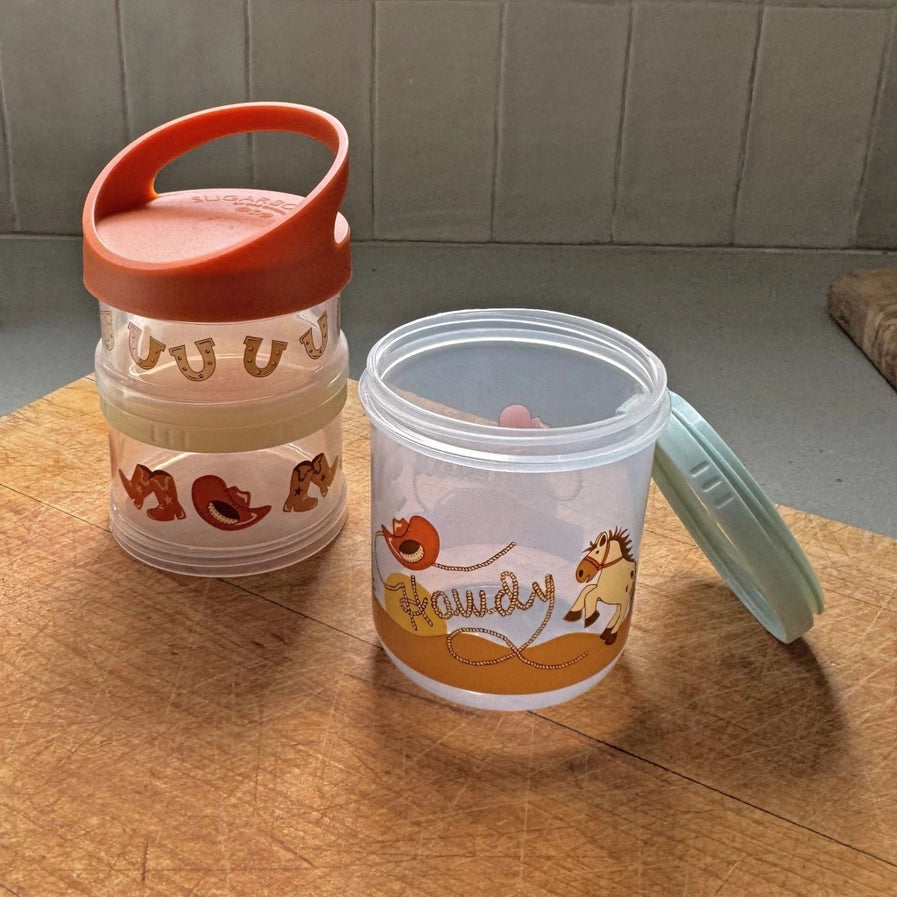 Howdy! Make every meal an adventure with the Howdy Twist & Snack Stacker, featuring an adorable boots and Howdy motif. The Twist & Snack Stacker is a stacking container for snacks, smoothie ingredients, or powdered formula. Stackers eliminate the need for plastic bags and keep food stacked, separated, and simple.