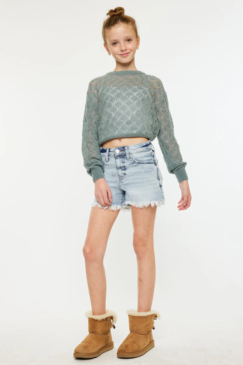 Marie High-Rise Kids Mom Shorts will provide your child with that fashionable appearance. In a light wash color that will be easy to style with their favorite tees and shoes! Made from a buttery denim fabric that allows them the comfort to stay active. With a classic 5-pockets, a frayed hem and a single button and zipper closure.