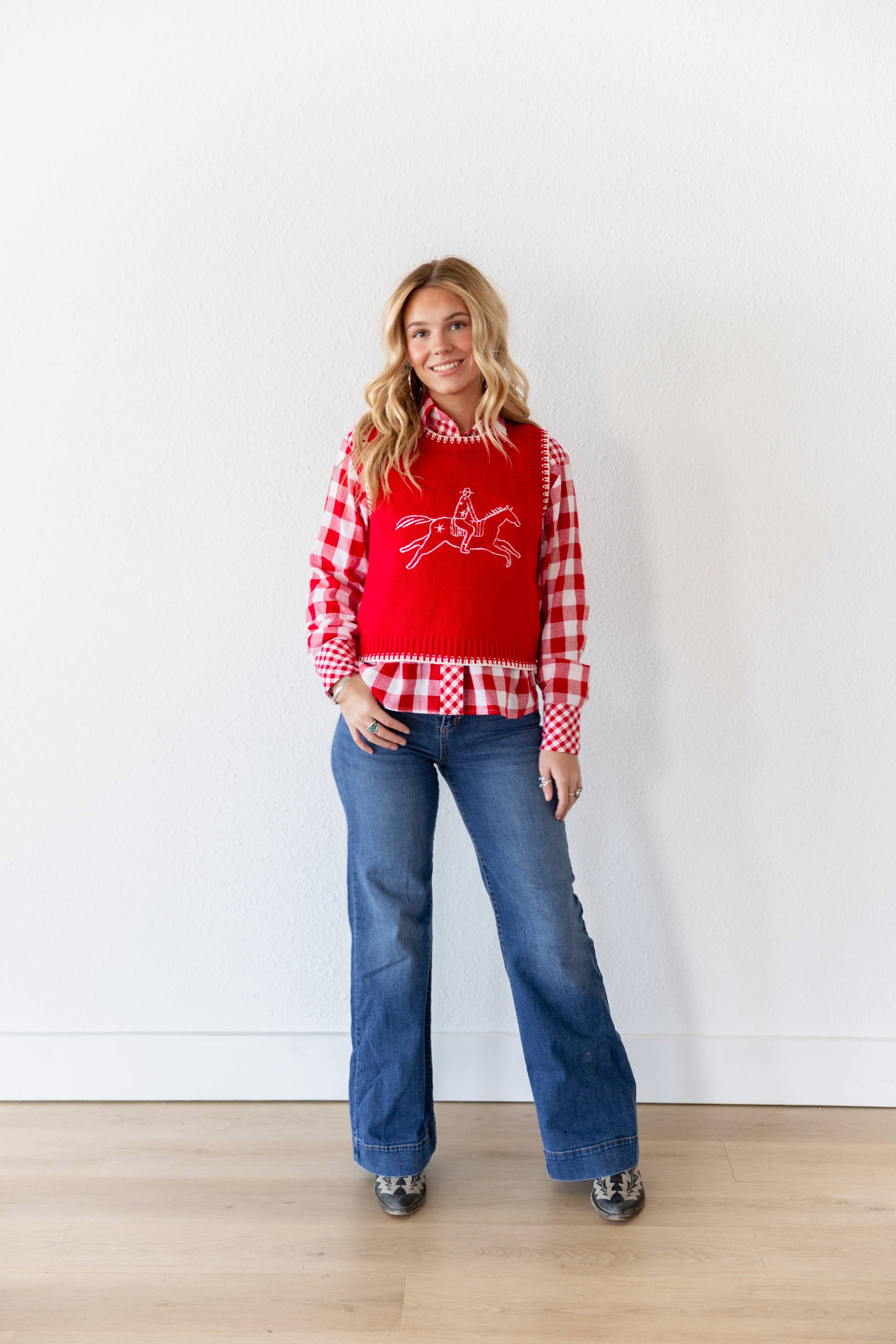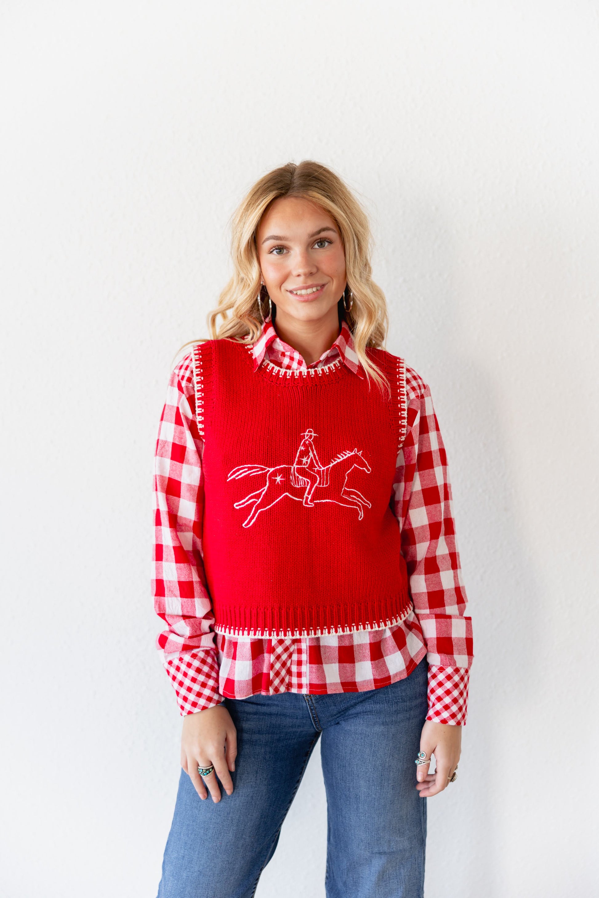 A bold western-inspired layering piece, The Star Rider Vest features a vivid red knit base with a white outline embroidery of a cowboy riding a galloping horse at center front. Crafted from a medium-weight knit material, this sleeveless pullover vest is finished with contrasting white whipstitch details at the armholes and hem. The ribbed crew neckline and hem offer structure and shape, while the relaxed fit allows easy layering over button-downs or blouses.