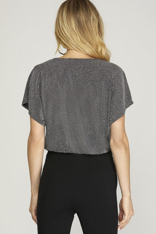 DROP SHOULDER LUREX STRETCH KNIT BODYSUIT WITH SNAP CLOSURE S:50%NYLON 45%POLYESTER 5%SPANDEX C:100%POLYESTER