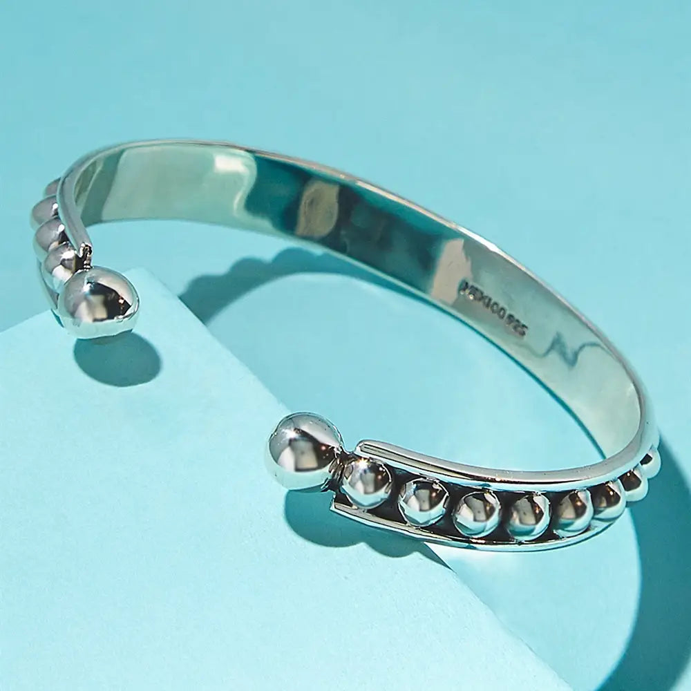 This piece showcases the beauty of sterling silver in a minimalist dot design that adds a touch of sophistication to any ensemble. Its sleek form perfectly complements the wrist, making it a versatile accessory for both day and night.