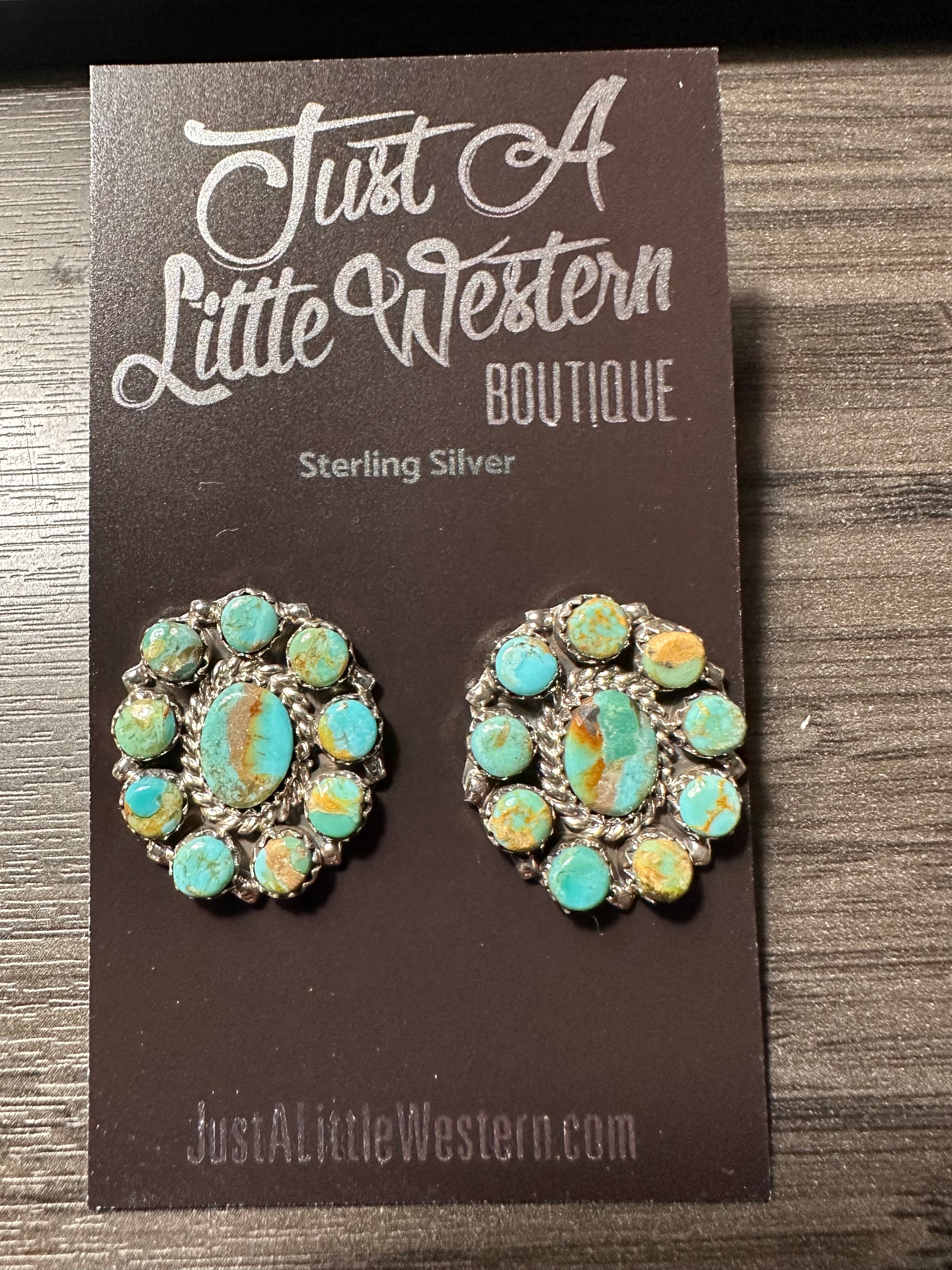 Genuine Indian Handcrafted Sterling Silver Oval Turquoise Cluster Stud Earring.