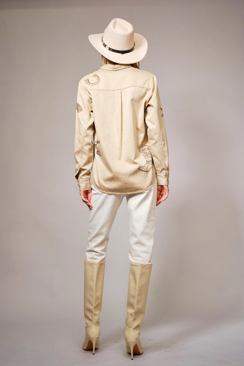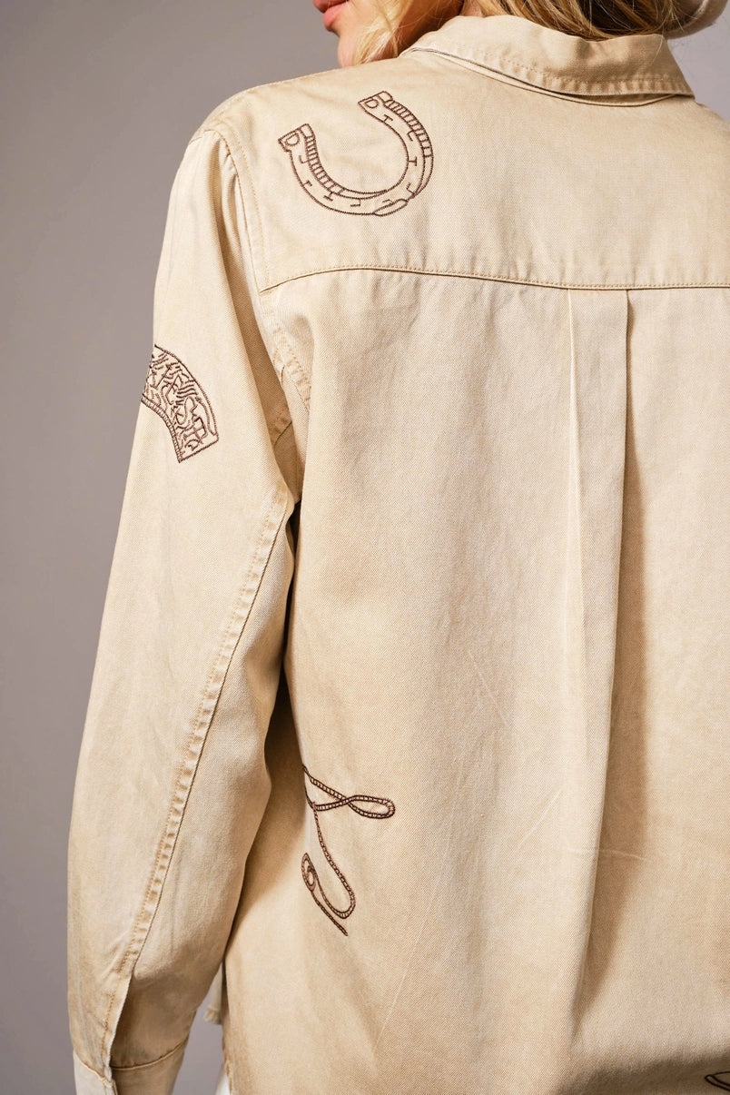 Garment-washed chambray shirt featuring western-inspired embroidery, a classic collar, and snap button closures. 80% Lyocell 20% Cotton