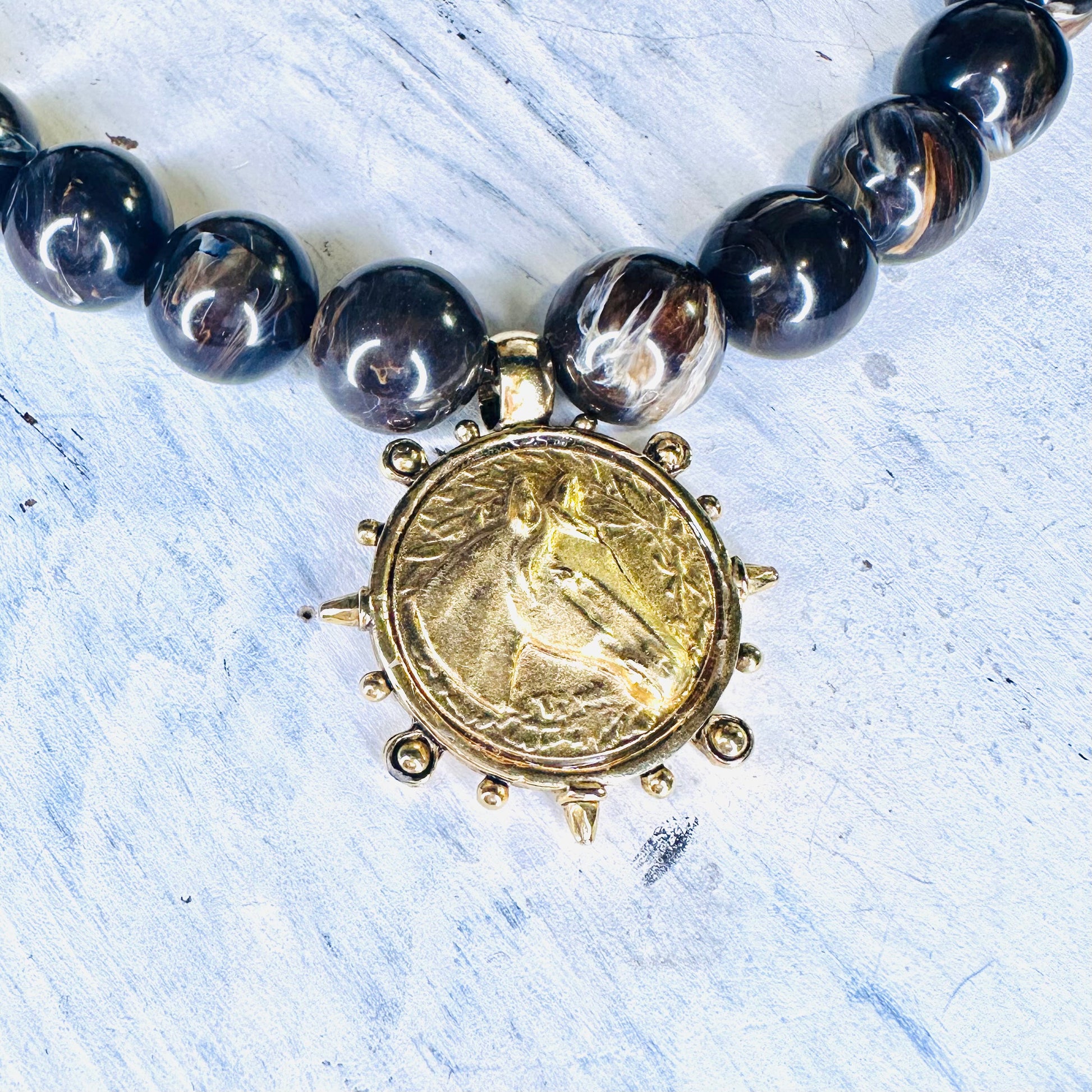 Yochi NY Large Brown Bead & Horse Coin Necklace